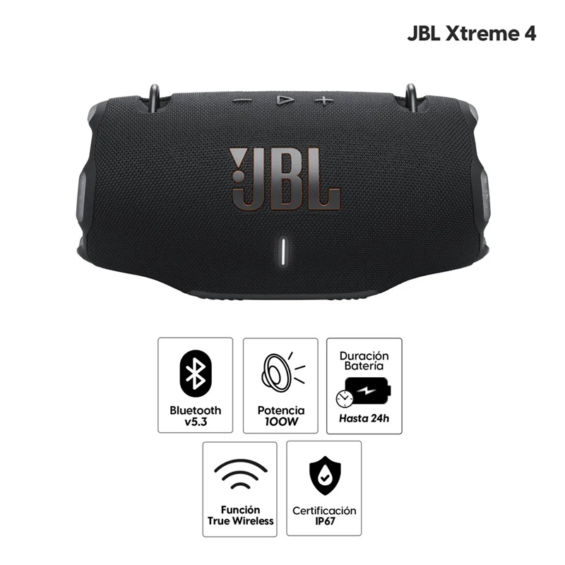 Compacto, potente y duradero, el JBL Xtreme 4 es ideal para quienes buscan audio de alta calidad, autonomía y resistencia en un altavoz portátil versátil.